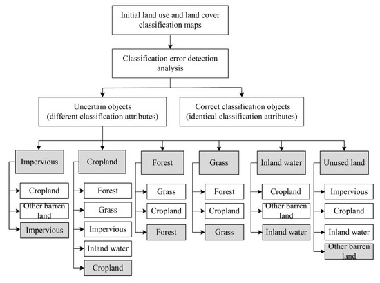 After hierarchical classification, error analysis showed that a certain amount of error could still be observed in the initial classified maps. To reduce these errors, updating and backdating approaches were used to generate more accurate LULC products (Figure 2). In this stage, classification error detection analysis was implemented, and 15 major misclassification scenarios occurred (Figure 3) (for coastal marshes, barren tidal flats and nearshore water, good classification results were achieved from the previous stage, so these three classes did not require updating/backdating). To perform updating/backdating, the overlay analysis method was first used to determine “correct classification objects” and “uncertain objects.” Objects with identical classification types (attributes) between the reference map (T0) (Table 1) and the initial classified map (Ti) were assigned as “correct classification objects.” Objects with different classification types between Ti and T0 were labeled as “uncertain objects.”