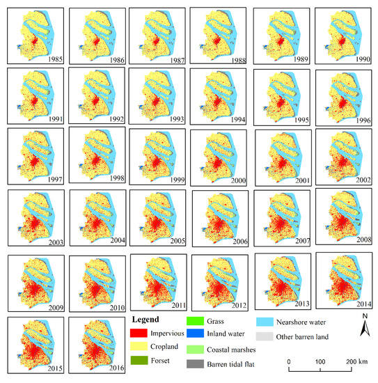 The spatial distributions of LULC types are clearly demonstrated in Figure 4, and the long-term changes are illustrated across each panel. The LULC classification results showed that great change was observed across the study area, especially change near the coastlines and peri-urban region. Specifically, cropland was the most extensive LULC type, but it continuously and rapidly decreased from 1985 to 2016. In contrast, impervious cover continuously and significantly expanded due to rapidly urbanization. Figure 4 also indicates that forest and grass substantially increased during the study period, although the proportions are still very small. The spatiotemporal distribution of coastal wetlands (including coastal marshes and barren tidal flats) varied and exhibited large fluctuations. Other barren land displayed an upward trend due to large-scale reclamation and the formation of increasing amounts of reclaimed lands from 2000 to 2016.