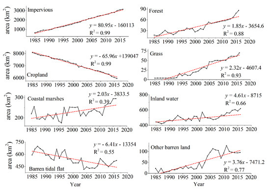 Quantitatively speaking, the land area of the study region increased by 730.13 km2 from 1985 to 2016, with an average annual increase of 23.55 km2. This increase was due to land reclaimed from coastal wetlands (coastal marshes, bare tidal flat and nearshore water). For specific categories, the cropland area continuously decreased from 8076.63 km2 (80.61%) in 1985 to 5959.33 km2 (55.44%) in 2016 (Figure 5), with an average annual decrease of 68.3 km2, and had a trend of continuous decrease (Slope = −65.96, R2 = 0.99). The impervious coverage increased from 642.84 km2 (6.42%) in 1985 to 3140.88 km2 (22.55%) in 2016, with an average annual increase of 80.58 km2, thus resulting in a trend to continuous increase (Slope = 80.95, R2= 0.99). This expansion was mainly at the expense of cropland. The area of forest and grass increased by more than triple the original area during this period due to the long-term implementation of urban greening. The proportion of inland water was stable from 1985 to 2008 and then experienced a slight increase from 2008 to 2016. The area of coastal marshes fluctuated. Barren tidal flat areas underwent continued declining trends due to long-term reclamation activities (Slope = −6.41, R2 = 0.55).