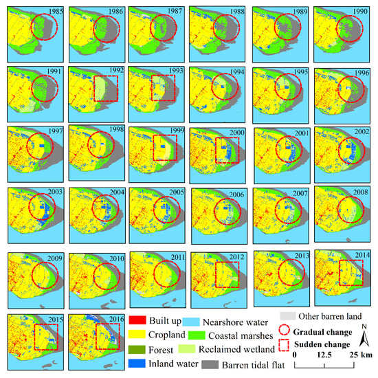 Figure 4. Annual time series of LULC maps of the Yangtze River estuary region from 1985 to 2016.