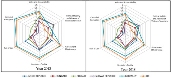 Worldwide Governance Indicators in Central Europe. Notes: (1) Worldwide Governance Indicators are displayed on a scale of −2.5 to +2.5, a higher score displaying better performance. (2) Germany and the UK are included in the figure as a developed country benchmark. (3) own figure based on data extracted from the World Governance Indicators [74] database.