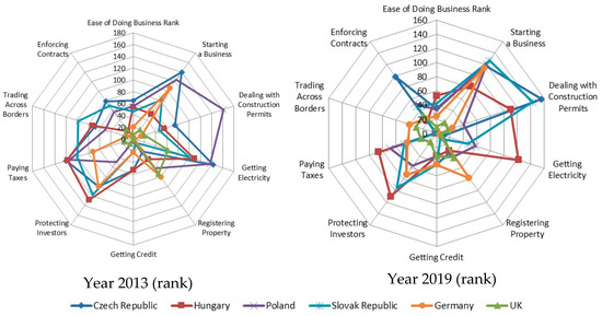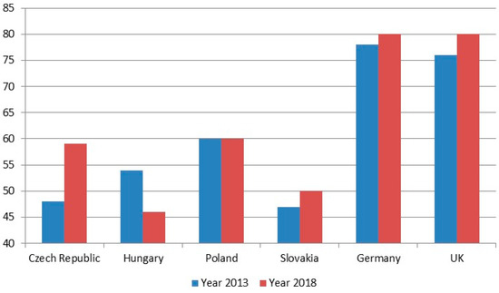 Corruption Perception Index calculations [73] show presence of corruption in both the private and the public sectors (see Figure 2). The impact of these factors on the business environments of the Central European Visegrád countries is substantial, signified by the Doing Business Indicators [72], displayed in Figure 3. The latest available information (2018) and the figures from the time of conducting the field work (2013) are presented side by side for illustration. Figure 1, Figure 2 and Figure 3 contain Germany and the UK as reference points, often viewed as a comparative benchmark in terms of institutional and economic performance in Europe.