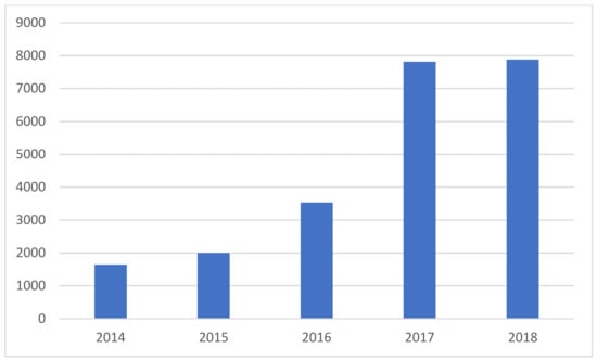 Number of Public Electric Buses in Beijing (2014–2018). Source: Social responsibility report, 2018 by Beijing Public Transportation Group. Available online: http://www.bjbus.com/elements/uploaded/material/2018.pdf.