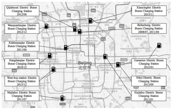 As shown in Figure 3, the Beitucheng charging station was the first one. Covering an area of 5000 m2 and funded by the Beijing Development and Reform Commission with more than thirty million yuan, the station was built in July 2008 to facilitate the operation of the electric buses during the Olympics Games. The station contains a total of 240 charging machines, each with a 7 KW capacity, and a pair of automatic battery changing robots. As a result, the station can provide replacement batteries, fast battery charging, battery charging process monitoring, and remote monitoring of the safe operation of EVs. In October 2015, the largest electric bus charging station, Xiaoyingbei station, covering an area of 26,500 m2 inside the terminal station of Line 13, began to operate. It can accommodate hundreds of electric buses, and the average volume of passenger traffic capacity rose to 18,700 per day.