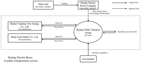 In regards to public electric buses in Beijing, a concise network of participants is shown in Figure 4 and mainly includes the most significant entities involved. As shown in the figure, corporations and their networks are quite simple. The Beijing Public Transport Group purchases electric buses from Beiqi Foton Motor Co. Ltd and Zhuhai Yinlong New Energy Co. Ltd, while electric power and charging infrastructure is provided by the Beijing Electric Power Company (owned by State Grid). The Beijing Public Transport Group also receives subsidies from the local and the central governments. All representative stakeholders in this research have shown in Table A1 in the Appendix A. Further analysis of incurring costs and revenues can be found in the next section.