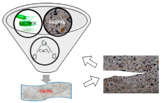 Bacteria genus Bacillus are used in this process, as well as bacterial nutrients. These can be calcium compounds, nitrogen and phosphorus. All the components are added to the concrete during the production process. The listed components remain non-reactive inside the material until the material is damaged, which can take up to 200 years. However, this period can be shortened when the concrete is damaged. The water in the outside environment will then start to penetrate the damage. In this case, the bacterial spores will be able to grow in convenient conditions. Soluble nutrients are transformed into insoluble calcium carbonate. Then, it solidifies on the damaged surface or inside the material. In this way, the concrete is sealed [6]. The bacteria consume oxygen during their growth, which is why the reinforcement does not corrode. This increases the durability of the concrete [1].