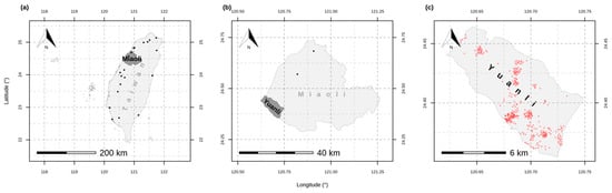 Study area of Yuanli Township, Miaoli County, Taiwan. (a) Taiwan map; (b) Miaoli county map; (c) Yuanli township map.