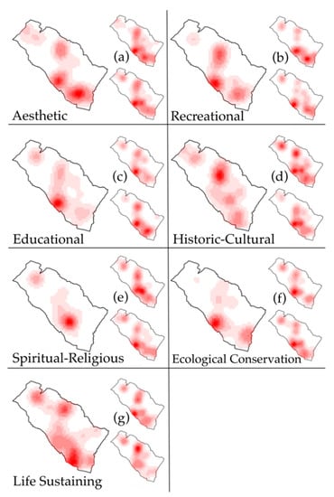 Mapped results for seven nonmaterial-intangible cultural ecosystem service (NICE) valuations. Note: For each NICE value map, left is Total surveyed population, top-right is Young Educated group, and bottom-right is Old Experienced group for (a) through (g).
