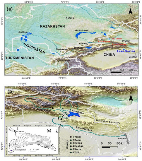 Lake Bosten was the largest freshwater body in north-western China and originates from the Kaidu River in the glaciated mountain ranges of Tian Shan; it is the source of the Peacock River (the source of Lop Nur) [47]. Lake Bosten is located at 1050 m above sea level and is 81 km long and 42 km wide, covering an surface area of 1005 km2 [48]. Lake Bosten has undergone significant changes over the past fifty years. For example, the water level of Bosten Lake varies significantly with fluctuations of 5 m, and the salinity has increased from ≈0.4 g/L in 1958–1960 to 1.48 g/L in 2008 [48,49].