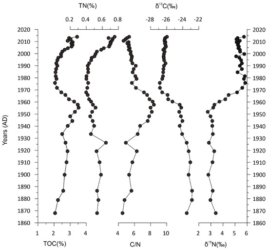 The organic materials, TOC, and TN in the lake sediments are mainly controlled by the initial productivity of the lake and by the input of terrigenous organic debris [60,61]. Different sources of organic matter have different C/N ratios—for example, the TOC/TN ratio. Aquatic phytoplankton are mainly rich in protein and organic nitrogen, so the C/N ratio is low (from four to 10). Terrestrial vascular plants are composed mainly of lignin and cellulose and lack nitrogen; thus, the C/N value of terrigenous organic matter is usually 20–30 [62]. The C/N ratio of lake sediments has been widely used to distinguish the source of sedimentary organic matter [63,64]. When the C/N ratio is less than 10, the organic matter is derived from aquatic plants; when the C/N ratio is greater than 20, the organic matter is derived from terrestrial plants. Therefore, the C/N ratio can be used to determine the source of the organic matter during the formation of sedimentary sequences. The average C/N ratio in the sediments of Lake Bosten is 6.1. The maximum value is 8.4, recorded ca. 1960. The results suggested the organic matter was mainly from aquatic plants and inferred the initial productivity in the lake. The variations in the organic geochemical proxies of the core sediments from Lake Bosten are shown in Figure 2. The average TOC is 2.7%, with a maximum of 3.5% and a minimum of 2.1%. From the baseline to 1960, there is an increasing trend for organic carbon content. Then, there is a significant decrease until 1980, with a minimum value of 2.1%. Since 1980, the organic carbon content gradually increases again. The average TN of the sediments is 0.53%, with a maximum of 0.75% and a minimum value of 0.40%. There are obvious similarities between TOC and TN.