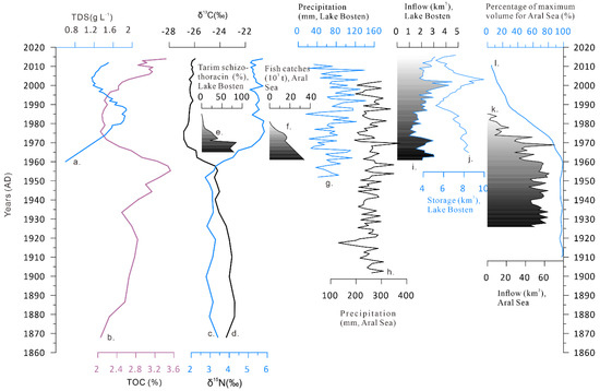 Comparative study of regional responses to human activity. (a) Total dissolved solids (TDS) [55]; (b) total organic carbon (TOC); (c) nitrogen 15N value (δ15N); (d) organic carbon 13C value (δ13C); (e) Tarim schizothoracin in the total catch percentage; (f) dynamics of fish catches in Aral Sea [53]; (g) annual precipitation (mm) recorded at the Yanqi weather station (location in Figure 1); (h) precipitation data within the Aral Sea drainage basin [54].(i) variations in inflow to Lake Bosten [55]; (j) Lake Bosten water volume (km3); (k) Amu Darya inflows to the Aral Sea [56]; (l) percentage of the maximum volume for Aral Sea [41]. For the sake of timing comparison, all curves have the same y-coordinates.