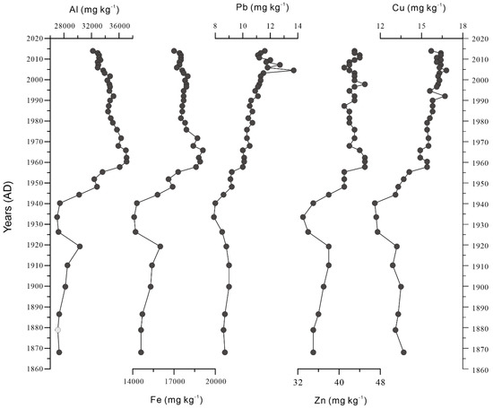 Sedimentary profiles of element contents: aluminium (Al), iron (Fe), lead (Pb), zinc (Zn), and copper (Cu).