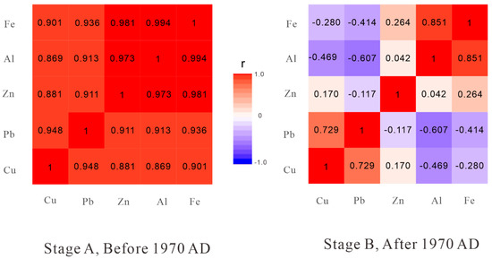 Correlation matrix among the elements aluminium (Al), iron (Fe), lead (Pb), zinc (Zn), and copper (Cu), in different stages: left for stage A (since 1970) and right for stage B (from 1868 to 1970).