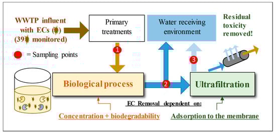 Analyzed samples were collected after primary, secondary, and tertiary treatments. Figure 1 schematically shows the entire water treatment process in the WWTP and the different sampling points selected. Different samples (BIO influent, UF influent, and UF effluent samples) used in this work were named according to this figure.