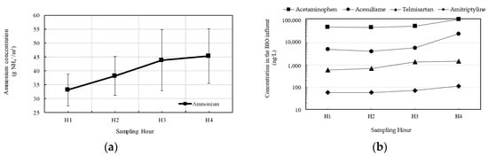 Concentration in the influent of the biological treatment at the different sampling hours of: (a) Ammonium; (b) certain representative emerging pollutants.