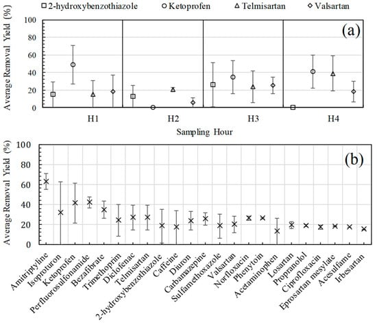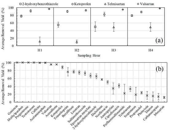 Average removal rates in the biological treatment for: (a) Four representative emerging pollutants at different hours; and (b) every emerging pollutant (with all samples).