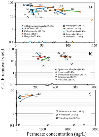 c-UF removal yields as a function of the permeate concentration for the emerging contaminants studied at: (a) low-, (b) medium-, and (c) high-concentration variability. Percentage average yields (values higher 10%) of each pollutant are given in brackets in the insets of the graphs. Values in the lower part of the graph correspond to yields below 0.1%.