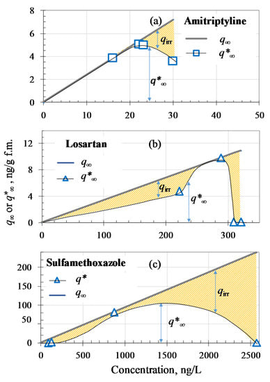 Consequently, highest removal yields will occur as q∞* approaches q∞. These favourable situations correspond to intermediate concentrations represented in Figure 6 by a large white area beneath the q∞ line, whereas qirr (shaded area) is negligible. This concentration range of high removal yields can be more or less centred depending on the compound. Thus, losartan and sulfamethoxazole present similar situations, whereas in the case of amitriptyline, the highest elimination yields correspond to the lowest concentrations.
