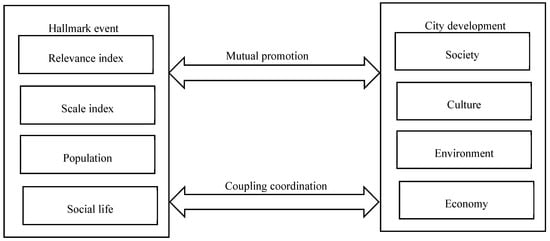 Coupling is a concept in physics that refers to two or more circuit elements, between the input and output or electric network, between which there is close cooperation and mutual influence; the interaction can be from one side to the other side of the phenomenon of energy transmission []. In other words, coupling is a measure of two or more entities that depend on each other. The concept of coupling is referenced by subjects such as atmospheric science, water science, ecology, economics, and agricultural science and a concept of systematic coupling has been put forward. The concept of coupling with the host cities and events can be defined as: in certain areas, events, and the host city of the mutual promotion and coordinated development, at the same time, between components of the two systems, interact with each other to further common resources and elements of reasonable allocation and promote the optimization of industrial structure and the organization of the structure, city spatial structure, function structure, and the process of forming event space layout and city space layout integration in the regional economy []. Coupling between events and host cities is not only the coupling between the two systems but also the coupling between the two elements of the two systems []. Through the division of labor and urban development and cooperation, complementary advantages, in order to promote the optimal allocation of resources, upgrade the industrial structure of the event and the city’s rational layout. With the increase in coupling degree, the elements of the two systems will be integrated organically into a regional dynamic open platform []. The network is made up of a sports network, a city network, and network resources. Through the network, the city space layout is decentralized, the industrial layout is centralized, and the city’s efficiency is maximized; on the other hand, different cities have different city functions and economic functions to allocate more resources in the wider region and to obtain the spillover effect between the individual events, and a single city cannot reach []. In a certain area, the spatial and temporal coordination and the coordination between event development and urban expansion are emphasized by the coupling of events and host cities (See Figure 1). The factors of the coupling development between events and host cities include natural resources and social resources, such as government policy, human cohesion, local social habits, and local culture.