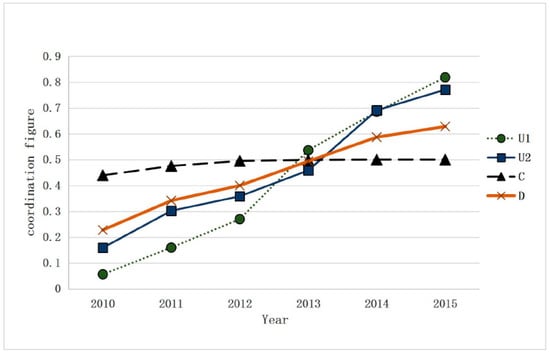 This study collected data covering a period of five years; the data show an uptrend, marked by an overall increase of the coordinated coupling degree between urbanization and mega-events, and S-shaped curves are produced. According to the results, this study divides the evolution of the coupling system into three distinct time periods (2010–2012 (two years), 2013–2014 (one year), and 2014–2015 (two years)). Our analysis takes into account the different degrees of coupling coordination and the level of comprehensive urban development and mega-events during these periods. The results of the analysis can be shown as follows (see Figure 2):