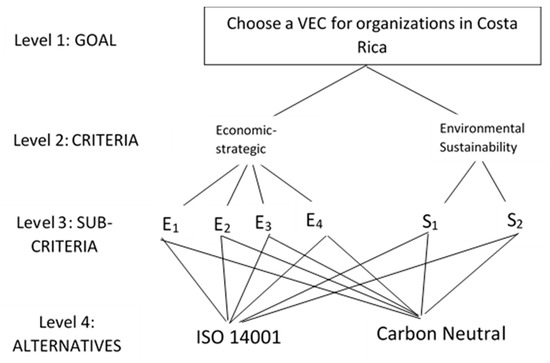 In this study, we use AHP to evaluate the preferences of firms when choosing between different VECs and, ultimately, the propensity of the same firms to choose a specific VEC. We apply our proposal to the selection of an environmental certification in a group of Costa Rican firms and public institutions. Costa Rica is considered an international leader in terms of environmental sustainability, especially in forest conservation and the reduction of the Greenhouse Gas (GHG) footprint [22]. Different public and private environmental approaches contributed to improve the environmental quality and green image of Costa Rican companies and the country itself [23,24,25,26,27,28].