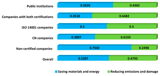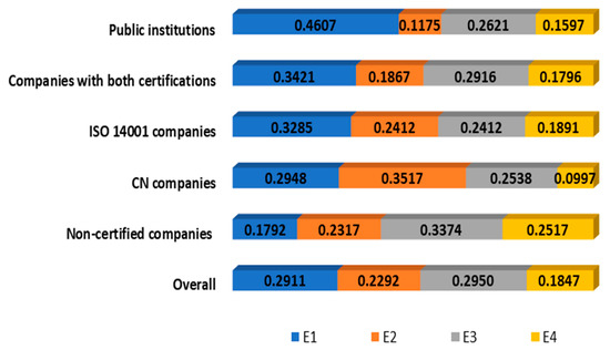 It is also revealing that “non-certified companies” is the group that gives greater importance to sub-criteria E3 (saving production costs or increasing productivity) and E4 (the cost of certification and investment in clean technologies). These results seem consistent with their decision of not adopting any of the alternatives, which we can naturally understand as the result of a traditional and purely economic cost-benefit analysis.