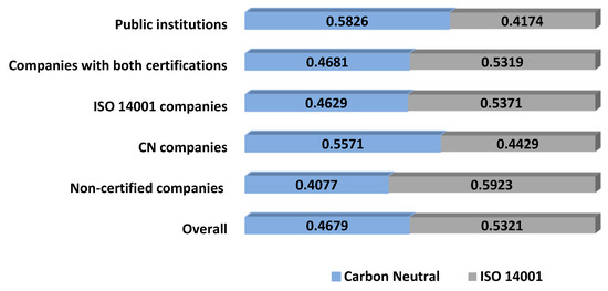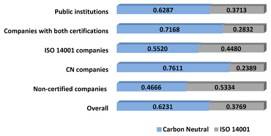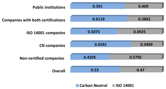 Finally, by using the global weights of all the criteria and sub-criteria, we can determine the most preferred option, as shown in Figure 8. Except for the group of companies without any certification, CN always receives higher global scores than ISO 14001. As expected, CN is particularly well considered among those institutions and companies that already adopted it, which we can interpret as a proof of consistency between their reported preferences and their observed behavior. It is remarkable; anyway that even those companies that adopted only ISO 14001 also attach a marginally higher score to CN than ISO 14001 (roughly, 0.51 vs. 0.49). Although this is not a strong result, the fact that these firms do not give a higher score to the certification that they adopted is already a surprise.