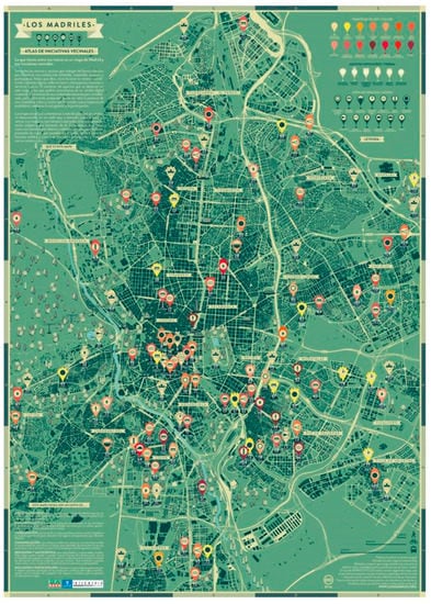 - Social innovation actions linked to participatory processes from which ideas are collected to carry out some urban interventions in the neighborhood. In this case, we want to highlight the Los Madriles project (Figure 1), started in 2015, which consists of an atlas of collectively generated neighborhood initiatives. Its objective is to generate a network between the different projects that are underway in Madrid and that share a social vision and community intervention. This initiative stands out for the diversity of promoters who managed to put the website into operation: the Federation of Neighborhood Associations of Madrid (FRAVM), Zuloark, the citizen initiatives incubator, all for praxis and Transversal Landscape collectives, social and neighborhood groups, and Intermediae, an experimental space devoted to socially engaged artistic practices approached from the angle of research and cultural innovation.