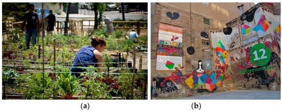 Figure 2. (a) Urban garden; (b) initiative in public space with the project This is not a site. - Social innovation action is linked to arts and creativity because culture can be the growth factor at the source of economic competitiveness and can also contribute to the social development and environmental sustainability of neighborhoods []. In this group, urban murals and paintings stand out. Artistic expressions are made in public space—buildings, facades, streets, and squares—with the aim of improving their image and recovering them not only from a physical point of view but also a social and economic one. In this sense, we must consider that some street art initiatives have resulted in urban regeneration, gentrification and tourism processes. However, while at first they can be valued positively since they revitalize the neighborhood, in the medium term, they can result in expulsion processes of the population due to the rise in housing and commercial real estate prices and the negative effects of mass tourism in specific urban sectors.