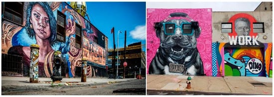 Cases like The Bushwick Collective in New York (Figure 3) are true outdoor art galleries, which have transformed a shady industrial neighborhood into a vibrant tourist destination. It has attracted numerous street, local, national, and international artists and thousands of street art fans since its first mural in 2011 [].