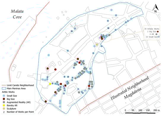 Figure 8. Distribution of the Meninas in Canido neighborhood. - This momentum has also been supported by municipal urban renewal initiatives to provide it with more livable spaces: functional squares, benches, trees, or larger sidewalks are elements that improve livability. In some of them, Las Meninas are part of their urban furniture.