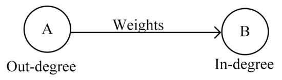Equations (8) and (9) analyze the transmission path for TWCN. There are two parameters, outward strength and inward strength. Outward strength or output strength () refers to the number of nodes connected by the arrow direction from the ith node. Input strength () refers to the number of nodes with the arrow direction connecting to the ith node.