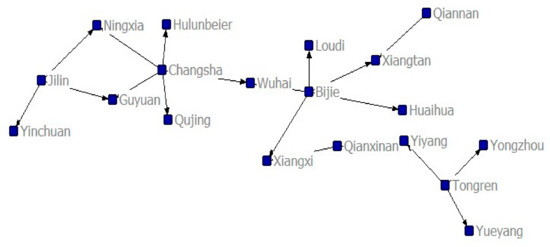 In the policy formulation process, policy makers often refer to and draw on relevant policy plans and policy concepts from other countries, regions, or departments. Therefore, this study makes the following assumption: the government departments that formulated the IMC incentive policies referred to previous relevant IMC incentives. The study used the Java program to calculate the relationship matrix among intercity IMC incentive policies, and UCINET to analyze the relationship matrix. Figure 2 shows an example of the relationship matrix for the connections between geographical locations when they adopt a particular IMC incentive policy. In this case, the policy is 3–5% floor area ratio in the tax policy. The topological structure of the transmission network for this incentive policy is shown in the figure.