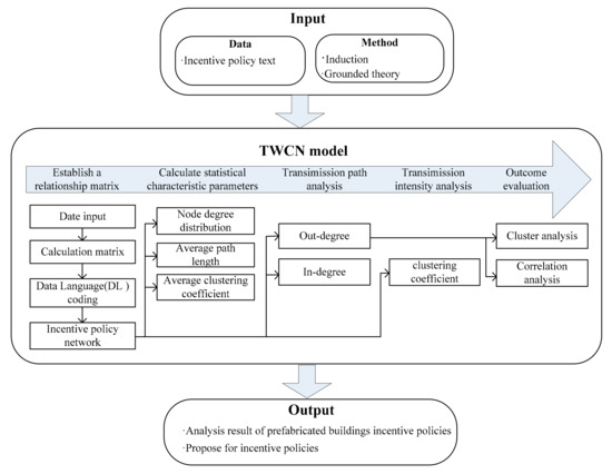 To explore the mechanisms of incentive policies, we designed a research method based on the path and intensity of policy transmission. Figure 3 shows the structure of the proposed TWCN. The first step of the proposed solution is to collect data on the incentive policies, which is then processed using the induction method and rooted theory. The next step is to construct the TWCN through the established relationship matrix, followed by statistical feature analysis. After the analysis, the research continues with the transmission characteristics and rules of the incentive policies based on an analysis of their conduction paths and intensities. Meanwhile, correlation and cluster analysis methods are used to evaluate the effects of TWCN to verify its reliability. The results of TWCN research are suitable for decision making with reasonable recommendations.