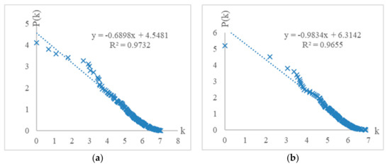 The statistical characteristics were analyzed with regard to node strength distribution and small-world characteristics of the TWCN for IMC incentive policies. The TWCN exhibits a long-tail characteristic in the logarithmic coordinates of the nodes’ distribution curves of out-degree and in-degree, which obeys the power law distribution. Figure 4a shows the out-degree distribution of node strengths of the TWCN; Figure 4b shows in-degree distribution of node strengths of the TWCN. Hence, incentive policies created by a few initiators (i.e., regions or cities) are cited by the rest. Furthermore, the complex network has scale-free characteristics.