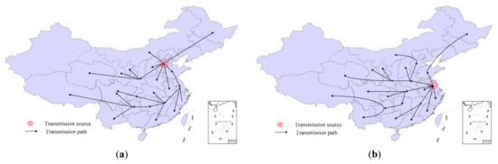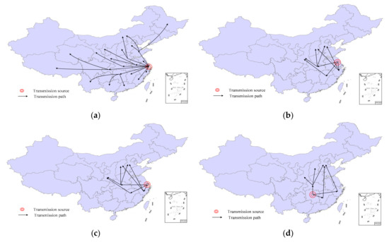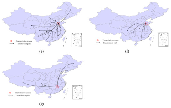 To identify the transmission routes, the following analysis integrated the key incentive elements in Table 2 and the distribution of out-degree and in-degree nodes in Table 4. Projects awarded is one of the most frequently quoted incentive policies for fiscal subsidy. The data show that this aspect was first mentioned in Shanghai and then disseminated to 26 provinces and cities (shown in Figure 5a). Jiangsu Province was the earliest initiator of total investment in IMC in progress measurement (shown in Figure 5b). It also has supporting policies of rural and affordable housing renovation projects. Shanghai was the first city to propose the policy of special funding for energy conservation of buildings (shown in Figure 5c). Hunan was the first province to propose including the IMC incremental charge in the construction cost (shown in Figure 5d). The transmission routes of IMC policies started from these initiators and spread to the neighboring coastal regions of Zhejiang, Hubei, and Jiangxi Provinces, which introduced them and then conveyed them to the northern region (e.g., Hebei and Shanxi Provinces) and western region (e.g., Shaanxi Province). For other financial types of incentive policies, Shandong Province was the first to propose the policies of base award (Figure 5e), subsidy (Figure 5f), and prefunding supervision (Figure 5g). Afterward, 19 provinces and cities referred to base awards and subsidies. However, only Hubei, Jiangxi, Sichuan, Guizhou, and Guangdong Provinces referred to the supervision policy of prefunding (Figure 5f). The transmission routes continued with Jiangxi Province (Figure 5g), which was the first to emphasize a preferential policy to attract investment. Then northeastern regions such as Heilongjiang and Liaoning Provinces cited this policy and western regions such as Sichuan and Tibet followed.