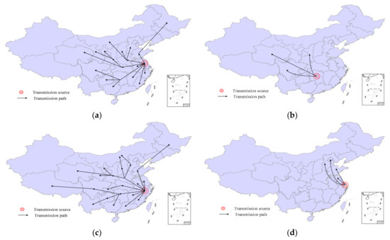 Another way to recognize the transmission routes is by analyzing incentive policies related to land use. Jiangsu was the first province to propose incentive policies by giving priority to land-use indices, such as a 3% plot ratio incentive, land supply by transfer, and land transfer installment payment, in addition to land supply allocation, bidding, auction, and hanging out shingles for land supply. Figure 6a shows that these policies are cited the most frequently by following provinces and cities in their subsequent incentive policies. For example, after seeing the satisfactory results of land-use policies, Hunan first introduced a 5% plot ratio (Figure 6b), which was later cited by Sichuan, Qinghai, Shaanxi, and other western regions to further strengthen the basis of the 3% plot ratio reward proposed by Jiangsu. Figure 6c shows that Zhejiang was the first province to recommend the land supply plan policy, which was subsequently cited by 26 provinces and cities. Nevertheless, the policy does not include an implementation plan. To improve operability, Shanghai started excluding construction areas for precast exterior wall panels (Figure 6d), accompanied by eastern coastal areas (such as Jiangsu and Shandong) and northern regions (such as Hebei and Beijing).
