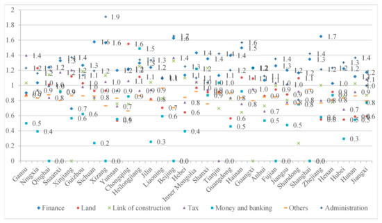 The clustering coefficient of TWCN reflects the tight connection between adjacent nodes. The larger the value, the more frequent the interaction among nodes, leading to greater intensity of incentive policies. Due to the policy hierarchy, the introduction of policy documents by various regional governments is affected by the application of provincial and ministerial policy documents. To analyze transmission intensity, we used the mean method to deal with the calculated clustering coefficient value of each node, which is categorized under provinces, municipalities, or autonomous regions. Figure 8 shows the transmission clustering coefficients of IMC incentive policies, confirming that fiscal and taxation policies have relatively larger clustering coefficients (0.6–1.4) than the rest of the coefficients illustrated in Figure 4a. The connections between these nodes are relatively more frequent than the rest as well, indicating that all provinces and cities in China pay more attention to these types of incentive policies than other types. Furthermore, Figure 8 shows that the clustering coefficients of finance, link of construction, and RDT policies are smaller than the rest, mainly concentrated between 0 and 1. These clustering coefficients specify that the connections between nodes are weak, indicating that the governments of these areas are less willing to issue incentive policies for IMC. Hence, the implementation of these policies is very limited in these areas.