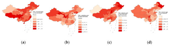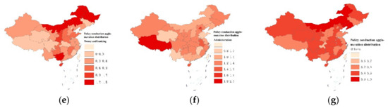 Figure 9e shows the spatial agglomeration of financial policies (specifically loans and banking). Heilongjiang, Inner Mongolia, Guangxi, and Shanxi have a significant impact on policy transmission. On the other hand, Qinghai, Tibet, Beijing, Fujian, and Shanghai have almost no impact on this type of policy. Incentives in financial policies involve consumer credit and corporate credit. Consumer credit includes preferential treatment for concessional loans, mortgage loans, loan quotas, and interest rates. Corporate credit supports lending and opens up green channels for finance.