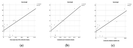 To find the node strength, this research uses the bivariate correlation coefficients on the total output value of the construction industry (X1), the construction area of the construction enterprise (X4), and the completed area of the construction enterprise (X5) for the influence of incentive policies. Table 8 shows the results of linear fitting performed by SPSS 25.0 software. R2 of the linear fitting model of X1, X4, and X5 is 0.434, 0.604, and 0.608, respectively. The corresponding sig. values are all below 0.05, which indicates that the correlation level is significant. The resulting linear fit curves are shown in Figure 10 for the completed area of the construction enterprise, the construction housing area of the construction enterprise, and the total output value of the construction industry as the independent variables. The strengths of IMC incentive policies are positively correlated. The incentive policies encourage the growth of the construction area, completed area, and total output value of the construction industry.