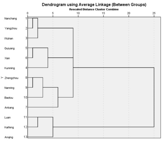 This research implements cluster analysis to verify that the spatial agglomeration of the selected 13 nodes for IMC development is consistent with the results of complex network analysis. Table 9 shows the calculation results of the analysis carried out on indicators X1, X4, and X5. Based on the results in Table 9, the results of cluster analysis are divided into four categories. Nanchang, Yangzhou, and Wuhan are in the first category. They are mainly in the eastern areas, in Hubei, Jiangsu, and Jiangxi Provinces. The cities of Lu’an, Kaifeng, and Anqing are in the second category. They are in the central area, in Anhui and Henan Provinces. Zhengzhou, Nanning, Ankang, and Baotou are in the third category. Kunming, Guiyang, and Xi’an are in the fourth category. The third and fourth categories are in the southwestern, northwestern, and northern regions (Shaanxi, Guizhou, Yunnan, and Inner Mongolia). According to the out-of-range value in Table 2 and Figure 11, the clustering result is larger in the first category because the intensity is greater than 500. The clustering result is decreased in the second category with a concentration between 300 and 500. For the clustering results in the third and fourth categories, the outswing values are mainly concentrated below 300. Therefore, from the results of cluster analysis of geographical regions, incentive policies for IMC are declining according to region, with the largest in the east, the second largest in the central region, and the least in the northwest, southwest, and north. The previous complex network analysis results are consistent with the correlation analysis of the samples, which confirms the scientific validity and rationality of the TWCN method.