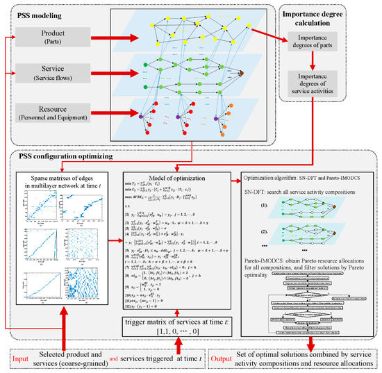 The framework of this fine-grained configuration optimization of the product-oriented PSS is shown in Figure 1. A PSS model is constructed based on a three-layer network, which contains product and services selected by the customer, and the resources in the system. A node in every layer (product layer, service layer, resource layer) of the multilayer network respectively represents an element (product, service, resource). The relationships between homogeneous elements in a layer and the relationships between heterogeneous elements in different layers are represented as edges. With appropriate decomposition, PSS can be clearly described by the proposed multilayer network. Elements and relationships in PSS can be expressed by connection matrixes, which make the description of the mathematical model and realization of optimization more convenient. By using this PSS multilayer network model, the importance degrees of service activities are analyzed based on the attributes of the multilayer network. A mathematical model based on the connection matrixes is constructed to express the objectives and constraints of PSS configuration optimization, and the corresponding solution algorithm is proposed to solve the mathematical model of optimization.