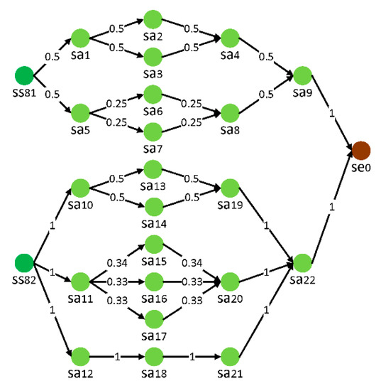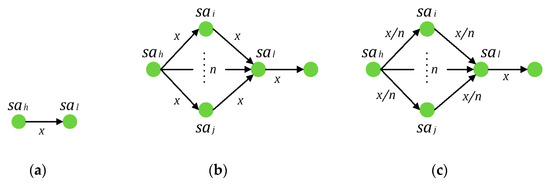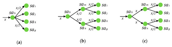 Then, the logical relationship between nodes in can be distinguished by values of and . However, if has multi inputs and multi outputs, as depicted in Figure 3a, the logical relationship between and other nodes will be uncertain. The virtual service activity node is applied to prevent that. Then, will become a node with a single input or single output, as shown in Figure 3b,c. There is not any essential service content in a virtual service activity node, so , , , , , and does not require any resources.