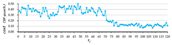 The decision process in multi-objective optimization is complicated. In solution C11, with the highest is not allocated to in the process of overall executing reliability maximization. In solution A3, , , , and are all allocated to . of these four resources is the highest among the same type of resources. In turn, the in solution A3 is higher than solution C11. For the remaining three , for whom the importance degrees are not conspicuously higher than each other, the resource allocation is not only based on , but also on the cost (as shown in Figure 9). By including the importance degree of with the objective function of executing reliability as weight, it enables more important to have higher executing reliabilities, by allocating with the highest to this . If the importance degree of is significantly higher, the impact on the overall executing reliability and executing cost will be tolerable.