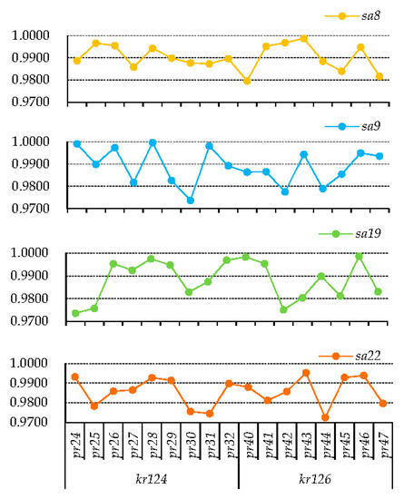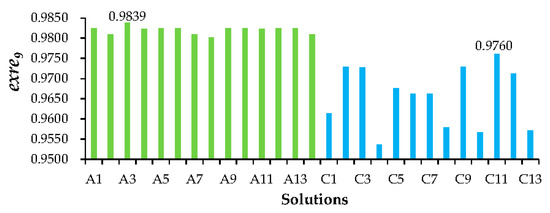 The executing reliabilities of () in different solutions with set A and set C are shown in Figure 10. The values of in set A are all higher than those in set C. The values of in solution A3 and C11 are the highest in set A and set C, respectively. Service activity compositions in solution A3 and C11 are the same. Comparing and analyzing these two solutions shows why maximizing , as one of the objective functions, could facilitate more beneficial solutions, in which service activities with higher importance degrees have higher executing reliabilities.