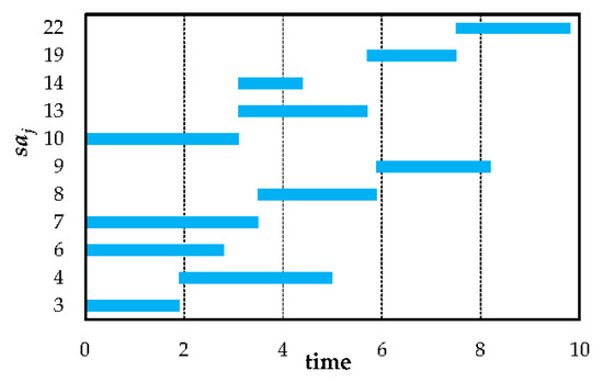 The Gantt chart of selected service activity nodes in solution A3 and C11 is depicted in Figure 11. From the perspective of the service time interval, overlaps with and , overlaps with , overlaps with other nodes. Situations of service time interval overlap between service activities are intricate. Consequently, resource allocation of one activity might influence another one and indirectly impact other activities.