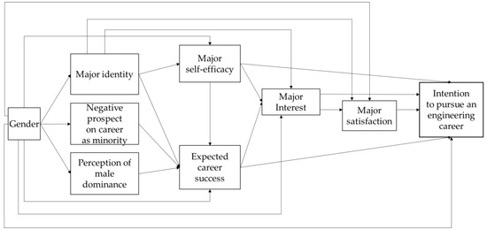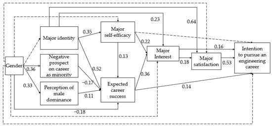 In the model, the final outcome, intention to pursue an engineering career, was predicted by gender, major self-efficacy, expected career success, major interest, and major satisfaction. Next, major satisfaction was predicted by gender, major identity, and major interest, while major interest was predicted by gender, major identity, major self-efficacy, and expected career success. Then, major self-efficacy was predicted by gender and major identity, while expected career success was predicted by gender, major identity, negative prospects on career as minority, and perception of male dominance. In turn, major satisfaction, major identity, negative prospects on career as minority, and perception of male dominance were predicted by gender. To evaluate the adequacy of the tested model, we employed the same criteria used in the confirmatory factor analysis accordingly to Hu and Bentler’s [70] recommendation (CFI > 0.90; SRMR ≤ 0.06).