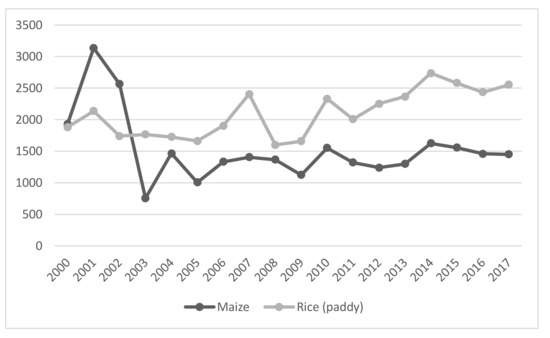 Yields (kg/ha) in maize and rice (paddy) 2000–2017, Source FAO-Stat 2019.