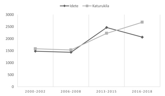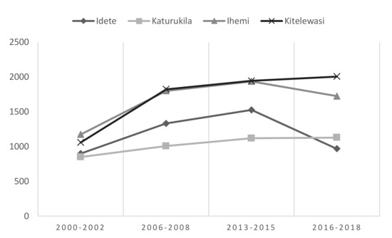 For rice yields, there is a large jump in yields between the second and third phases of the project, and then, as seen in Figure 4, a slight drop in the case of Idete and a continued rise in Katurukila. The difference since the start of the project is quite remarkable in the case of Katurukila, where yields grew from 1579 to 2682 kg/ha, equivalent to a 70% increase. A smaller increase can be seen in Idete, from 1487 to 2062 kg/ha, corresponding to 40%. Both these differences are statistically significant at the 1% level. The jump in yield coincides with the period when the input subsidy was extended to rice since 2008 [22].