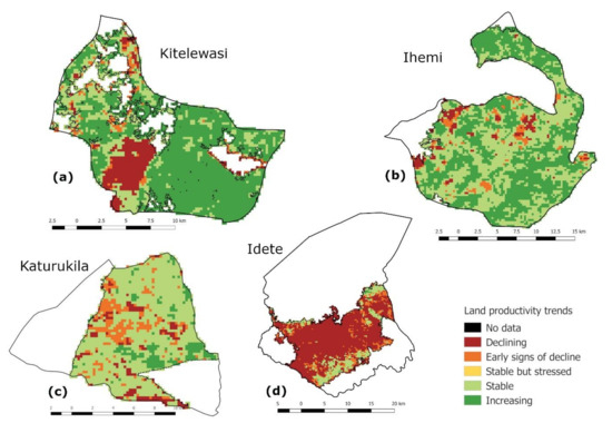 The four investigated villages. (a) Kitelewasi, (b) Ihemi, (c) Katurukila, and (d) Idete. Maps show land productivity trends for cropped parts of villages.